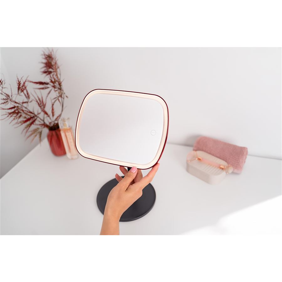 Kosmetické zrcadlo BEURER BS47 s osvětlením z limitované edice Ripe Cherry nabízí tři režimy světla – teplé, studené a přirozené – díky čemuž je ideální pro každou situaci. Magnetický držák umožňuje snadno nastavit jeho polohu nebo jej odebrat a použít jako ruční zrcadlo. Ovládání je velmi pohodlné díky dotykovému senzoru integrovanému přímo na ploše zrcadla. Zrcadlo zaujme také mimořádně velkou zrcadlovou plochou o rozměrech 21 x 15 cm, která poskytuje dostatek prostoru pro detailní úpravy.